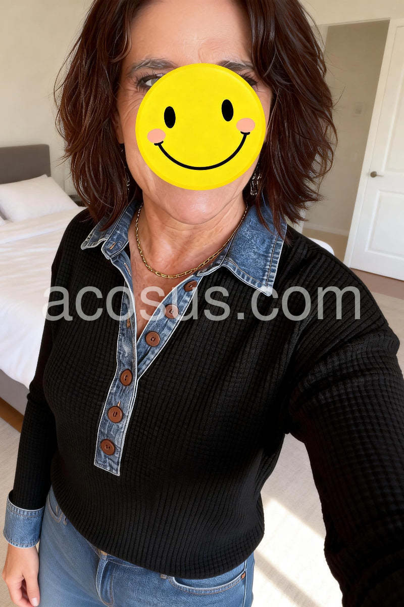 Cool Long Sleeve Denim Collar Button Front Top