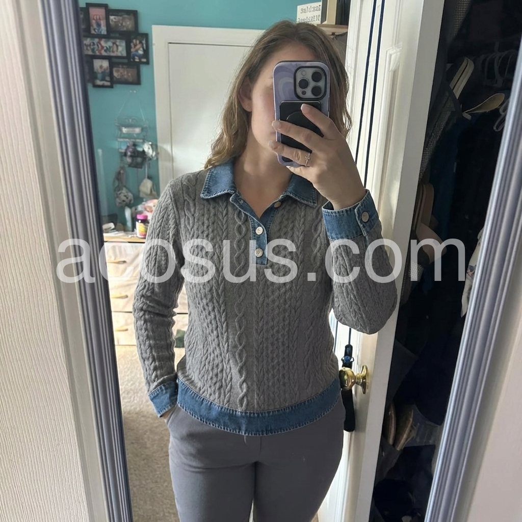 "Yes!It runs true to the garment size chart please choose your size based on your measurements."Elevate your casual wardrobe with this sophisticated grey cable knit sweater, featuring a distinctive denim collar that bridges classic and contemporary style. The intricate cable pattern adds textural depth and visual interest, while the long sleeves provide warmth and versatility for layering. Crafted with attention to detail, this piece transitions seamlessly from weekend wear to smart-casual settings, offering the comfort of premium knitwear with refined aesthetic appeal.