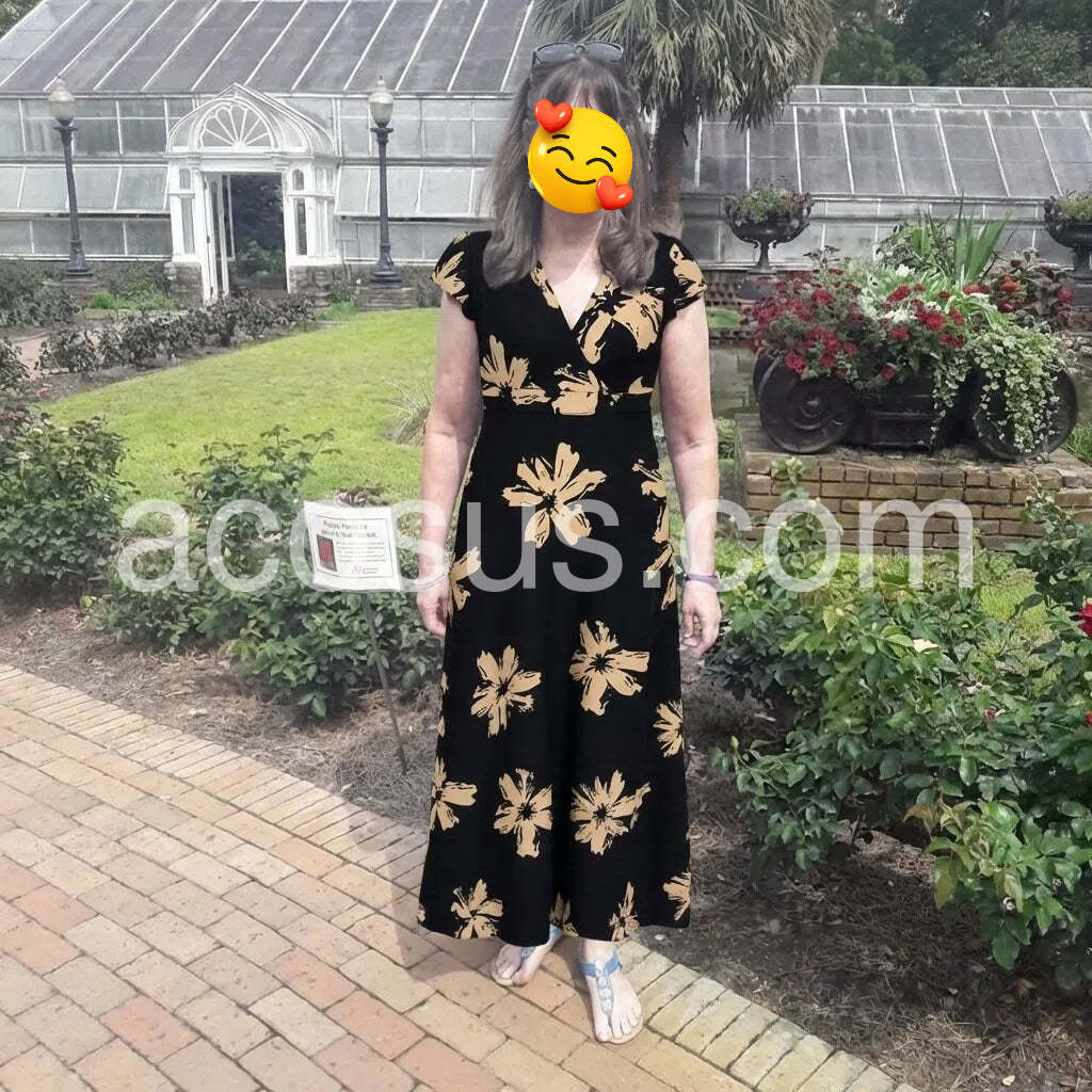 I absolutely love this dress! The black and beige floral pattern is incredibly striking and elegant. I wore it to a beach wedding and received so many compliments. The v-neck is flattering without being too revealing, and the material is soft and flowing. Highly recommend!