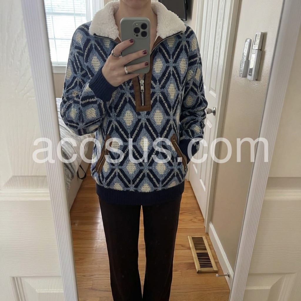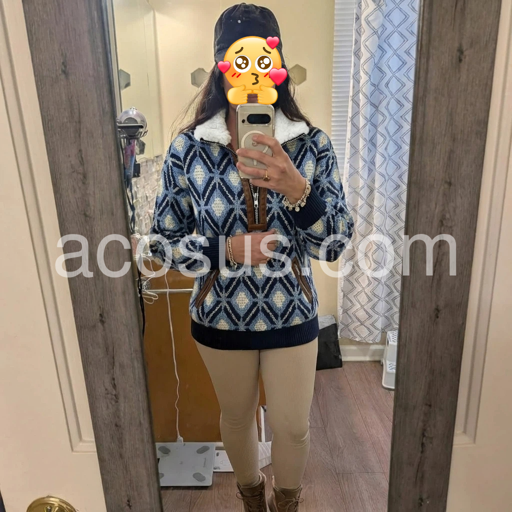 "Yes!It runs true to the garment size chart please choose your size based on your measurements."Elevate your cold-weather wardrobe with this sophisticated knit sweater, featuring a striking blue geometric pattern that adds visual interest to any ensemble. The fleece lining provides exceptional warmth and comfort, making it an ideal choice for layering or standalone wear during transitional seasons. Crafted from quality knit fabric, this piece combines contemporary design with practical functionality. The geometric detailing brings modern flair while maintaining versatility—pair it effortlessly with jeans, trousers, or skirts for polished everyday styling.